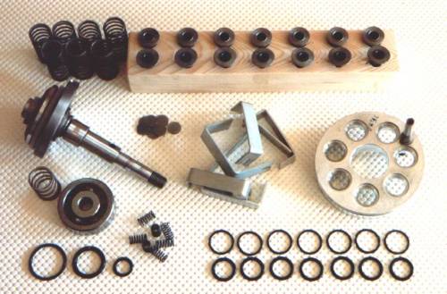 Sur la photo ci-dessous on aperçoit, parmi les diverses pièces de la pompe, le ratelier en bois que j'ai réalisé pour éviter de melanger les pistons et chemises, ainsi que les étriers vendus par Fenwick, mais qui ne sont pas indispensables au remontage.